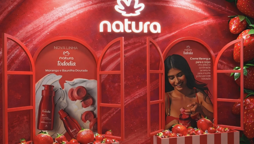 A Natura se consolidou como referência em cosméticos ao valorizar ingredientes naturais e bem-estar. A marca aposta em experiências sensoriais, como o espaço interativo da linha Tododia Morango e Baunilha.